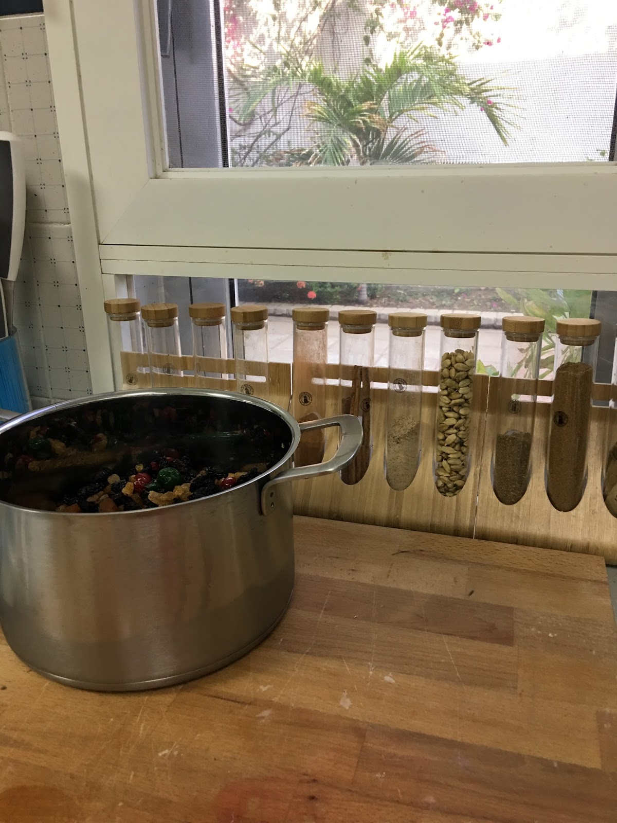 - cover the mixture with a half and half mix of fruit juice (cranberry or cherry juice is tasty) and water;